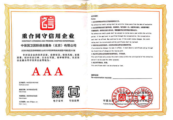 中保國衛(wèi)國際保安服務(wù)(北京)有限公司,屬中保國衛(wèi)集團(tuán)旗下子公司。能全方位的為大型客戶提供優(yōu)質(zhì)的安保、押運服務(wù),是集人防和技防于一體的新型正規(guī)化綜合安保押運服務(wù)企業(yè),提供人防、物防、技防、聯(lián)網(wǎng)報*、非武裝押運等安防相關(guān)的一站式服務(wù)。 公司在國內(nèi)多省設(shè)立有分公司及分支機構(gòu),著重提升安全押運、智能技術(shù)押運及安全技術(shù)防范相關(guān)的服務(wù),業(yè)務(wù)范圍覆蓋全國一、二線城市、港澳地區(qū)以及海外地區(qū)。安保方面主要為政府機構(gòu)、金融機構(gòu)、企事業(yè)單位、醫(yī)療衛(wèi)生、高等院校、工業(yè)園區(qū)、大型商場、高檔住宅、智能商務(wù)樓、大型活動提供門衛(wèi)、守護(hù)、巡邏、押運(非武裝)、安全檢查、保安特勤、私人護(hù)衛(wèi)、消防中控、安全技術(shù)防范、遠(yuǎn)洋護(hù)航等全方位服務(wù),同時面向國際市場,為中資企業(yè)在“一帶一路”沿線國家投資提供境外安保服務(wù)。 >> 更多內(nèi)容 |
